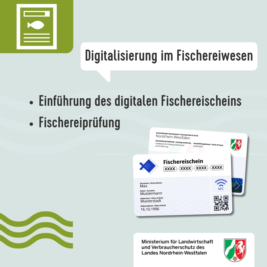 Aktuell wird die Fischereischeinverwaltung in Nordrhein-Westfalen auf moderne und digitale Verfahren umgestellt. Nach Verabschiedung des Landesfischereigesetzes durch den Landtag Nordrhein-Westfalen können Bürgerinnen und Bürger voraussichtlich ab dem 1. Juli 2026 zwischen einer Antragstellung vor Ort in der örtlich zuständigen Behörde (Gemeinde oder Stadt) oder via Onlinedienst rund um die Uhr von Zuhause aus wählen. Mit der geplanten Änderung des Landesfischereigesetzes werden Fischereischeine im neuen Format als fälschungssichere Scheckkarten mit NFC-Chip und als elektronische Zertifikate auf dem Smartphone eingeführt.
